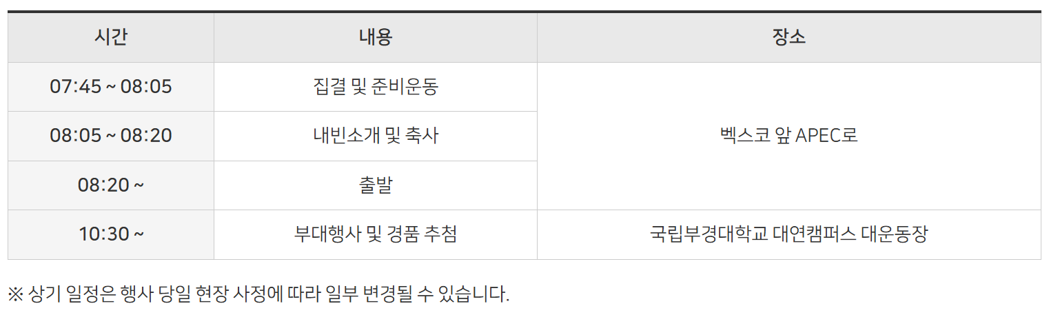 - 벡스코 광장(출발) → 다이아몬드브리지(광안대교 상판) → 국립부경대학교 대운동장(도착)