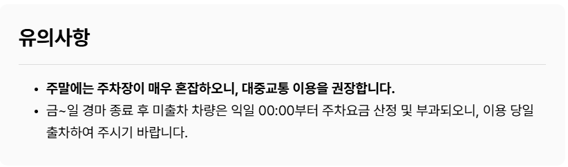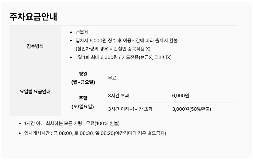 - 일반차량: 3시간 초과 6,000원 / 1~3시간 3,000원