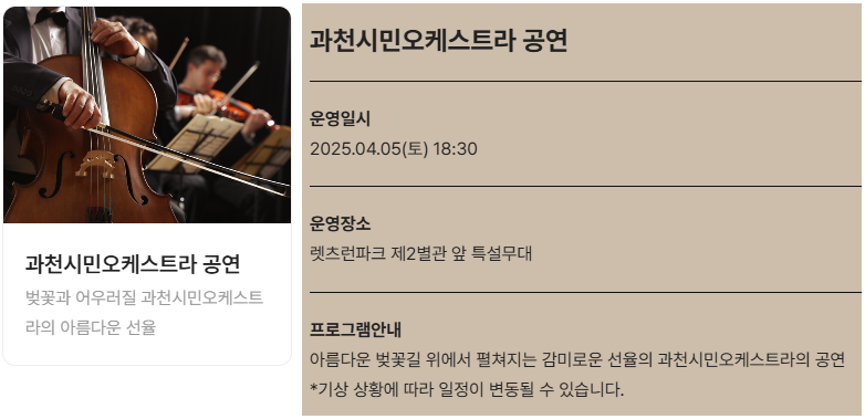 ⑤ 벚꽃길 버스킹 공연 축제 기간 주말 오후에는 감미로운 음악이 흐르는 벚꽃길 버스킹이 열립니다. 편하게 산책하며 음악까지 함께할 수 있는 낭만적인 시간입니다.