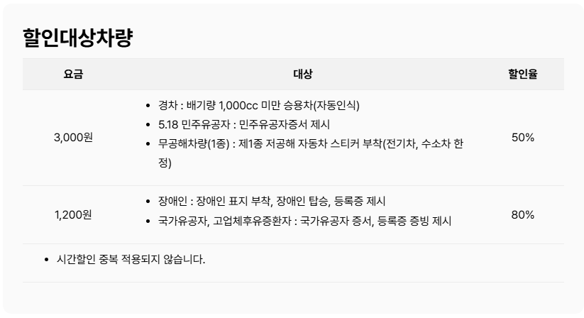 - 할인 대상: 경차, 무공해차량 등 3,000원 / 장애인, 국가유공자 등 1,200원