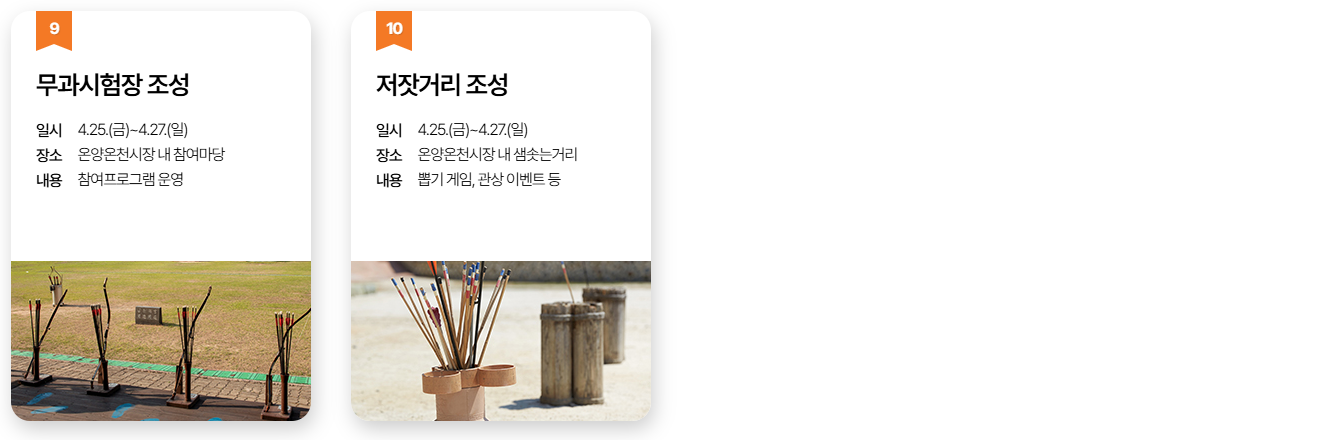 갑옷 착용 체험, 활쏘기, 군기 만들기 등 오감을 자극하는 체험 부스가 다채롭게 마련되어 있습니다.