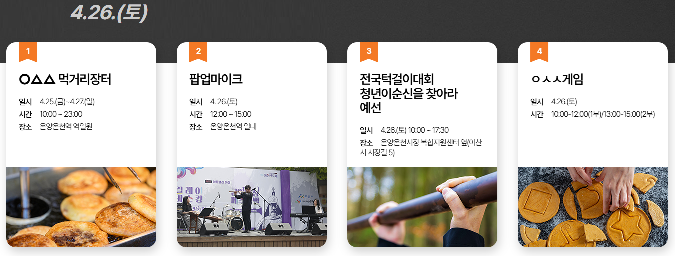 온양온천시장과 축제장 인근에는 먹거리와 장터가 가득 차려져 있어 배를 든든히 채우며 즐기기 딱 좋아요.