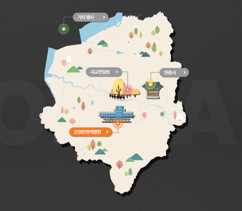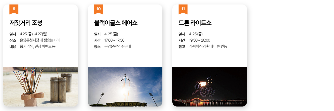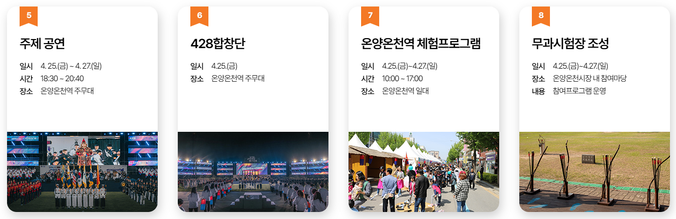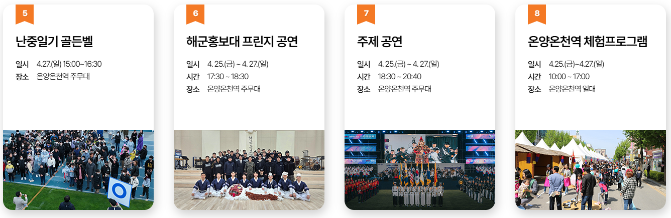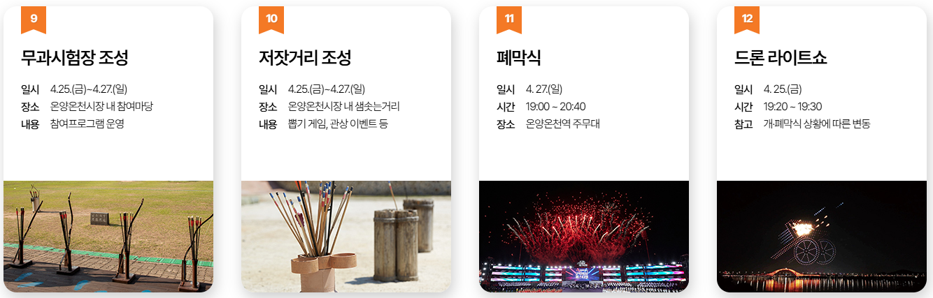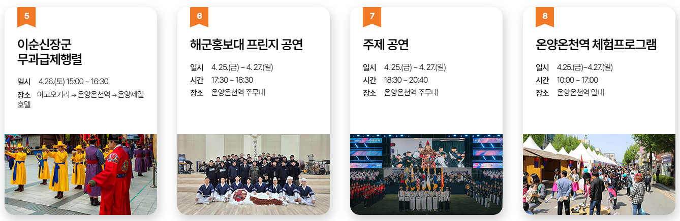 - 장소: 아산시 온양온천역 광장, 곡교천, 현충사 일원