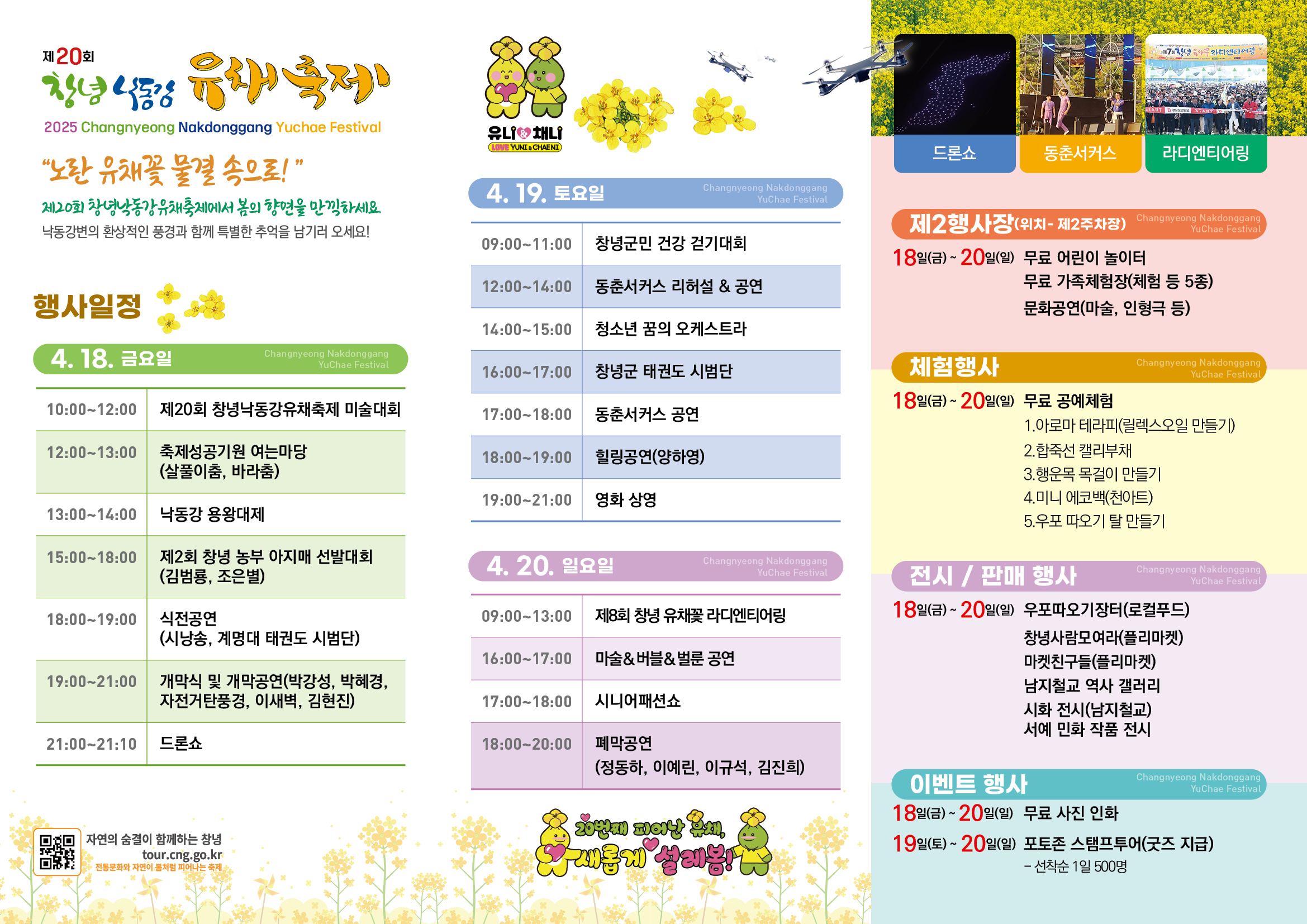 제20회를 맞이한 창녕 낙동강 유채축제는 올해 다소 조용하고 소박한 분위기 속에서 개최됩니다. 하지만 자연이 전해주는 감동, 유채꽃의 찬란한 색감, 그리고 가족이나 친구와 함께 걷는 그 따뜻한 시간은 그 어느 해보다도 깊은 인상을 남길 것입니다.