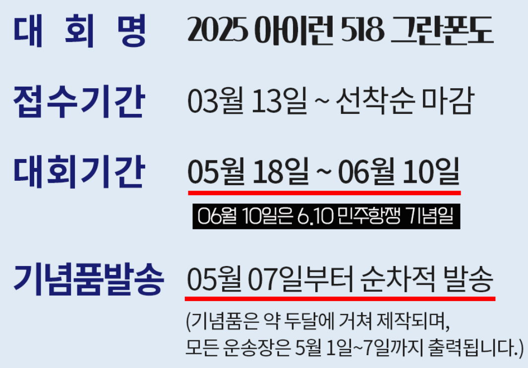 '2025 아이런 518 그란폰도'는 단순한 러닝 대회를 넘어, 역사적인 의미를 되새기고, 개인의 건강과 사회적 기여를 동시에 실현할 수 있는 특별한 기회입니다. 여러분의 많은 참여를 바랍니다!