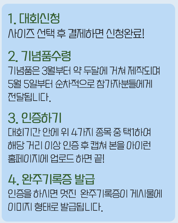 - 기록증 발급: 대회 종료 후 홈페이지에서 완주 기록증 다운로드 가능