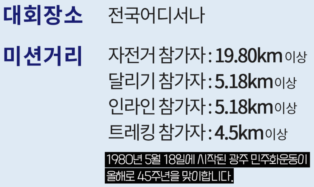 '아이런 518 그란폰도'는 5·18 민주화운동을 기념하고, 개인의 건강과 사회적 기여를 동시에 실현할 수 있는 비대면 장거리 러닝 대회입니다. 참가자들은 정해진 기간 동안 목표 거리를 달성하고, 이를 인증하여 완주 기록증을 받을 수 있습니다. 이 대회는 경쟁보다는 개인의 목표 달성과 의미 있는 기부를 중시하는 행사로, 참가비의 일부는 사회단체에 기부됩니다.