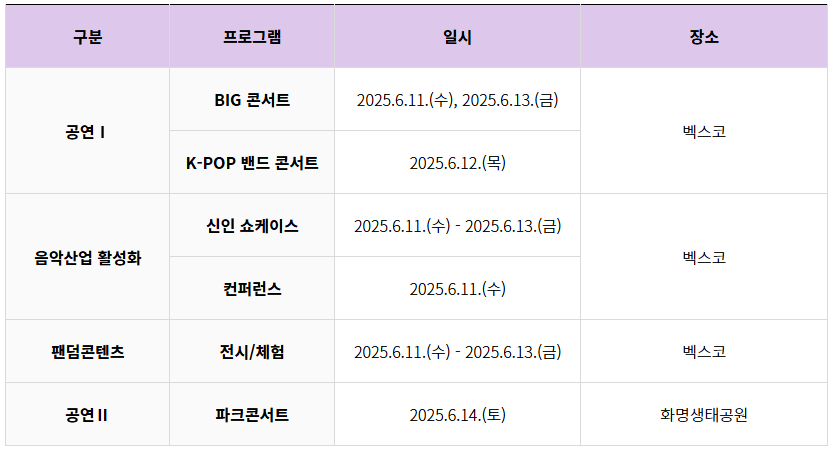 - 메인 콘서트: 2025년 6월 11일(수) ~ 13일(금)