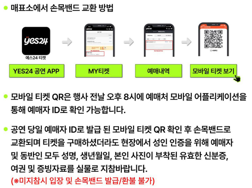 - 모바일 티켓 사용: 예스24 앱을 통해 예매 후 QR코드로 현장 매표소에서 입장 팔찌로 교환해야 합니다.