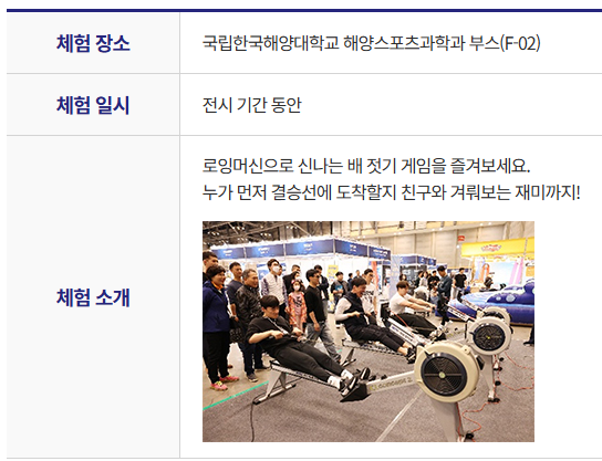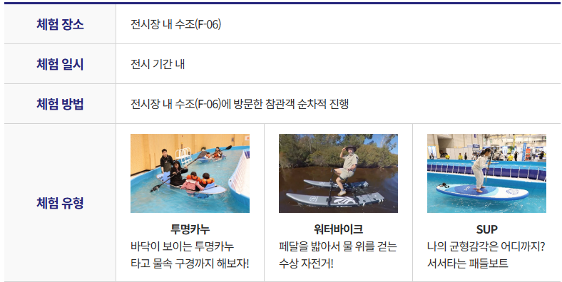 - 주요 내용: 요트·보트 전시, 해양레저 장비 소개, 비즈니스 상담회, 해양레저 체험행사, 전문가 포럼 등