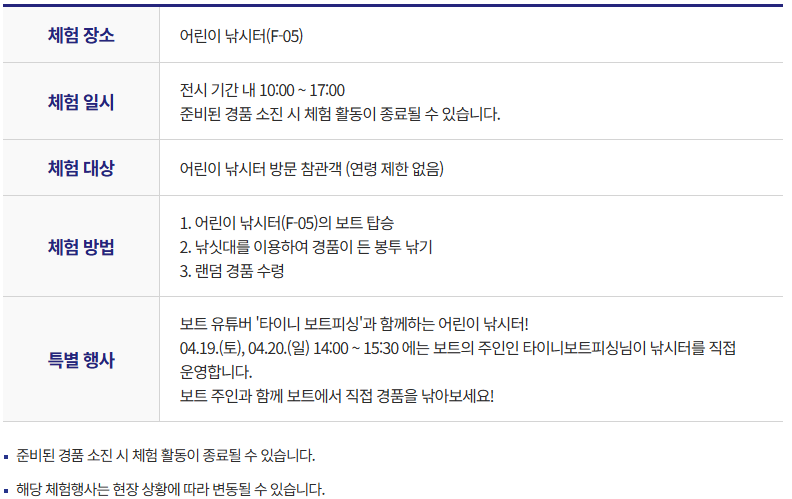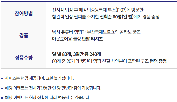 전시장 입장 후 해상탑승등록대 부스(F-07)에 방문한 참관객 입장 팔찌를 소지한 선착순 80명(일 별)에게 경품 증정