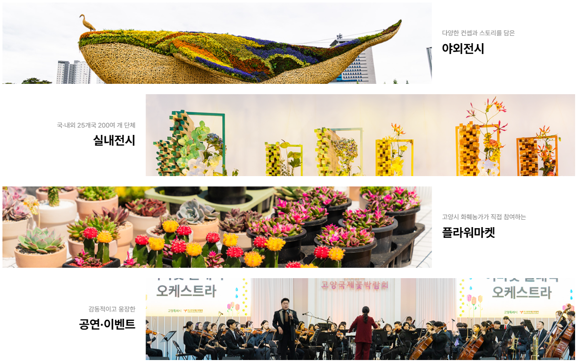 - 주요행사 : 야외 화훼전시, 실내 화훼전시, PentaFloral(글로벌 화예작가 작품전), 공연·이벤트, 고양플라워마켓