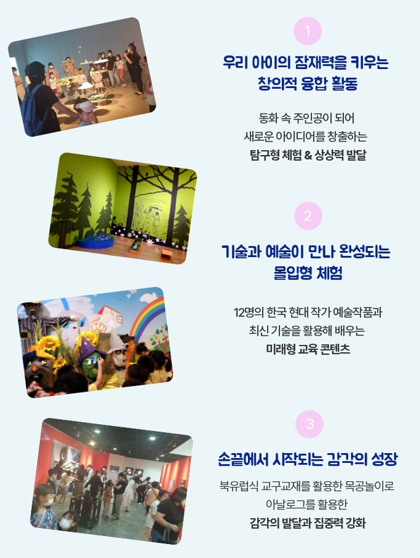 - 특징: 동화 속 세계를 현대 미술로 재해석한 체험형 전시