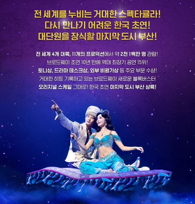 매직카펫이 눈앞에서 떠오르는 마법 같은 장면, 귀에 쏙쏙 들어오는 명곡들, 화려한 무대와 퍼포먼스를 부산에서 직접 만날 수 있다니, 상상만 해도 설레지 않나요?