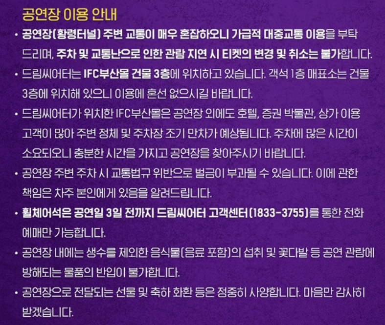 공연장 전용 주차장이 있지만 협소하니, 가능한 한 대중교통 이용이 좋아요. - 공연 중 사진/영상 촬영 금지