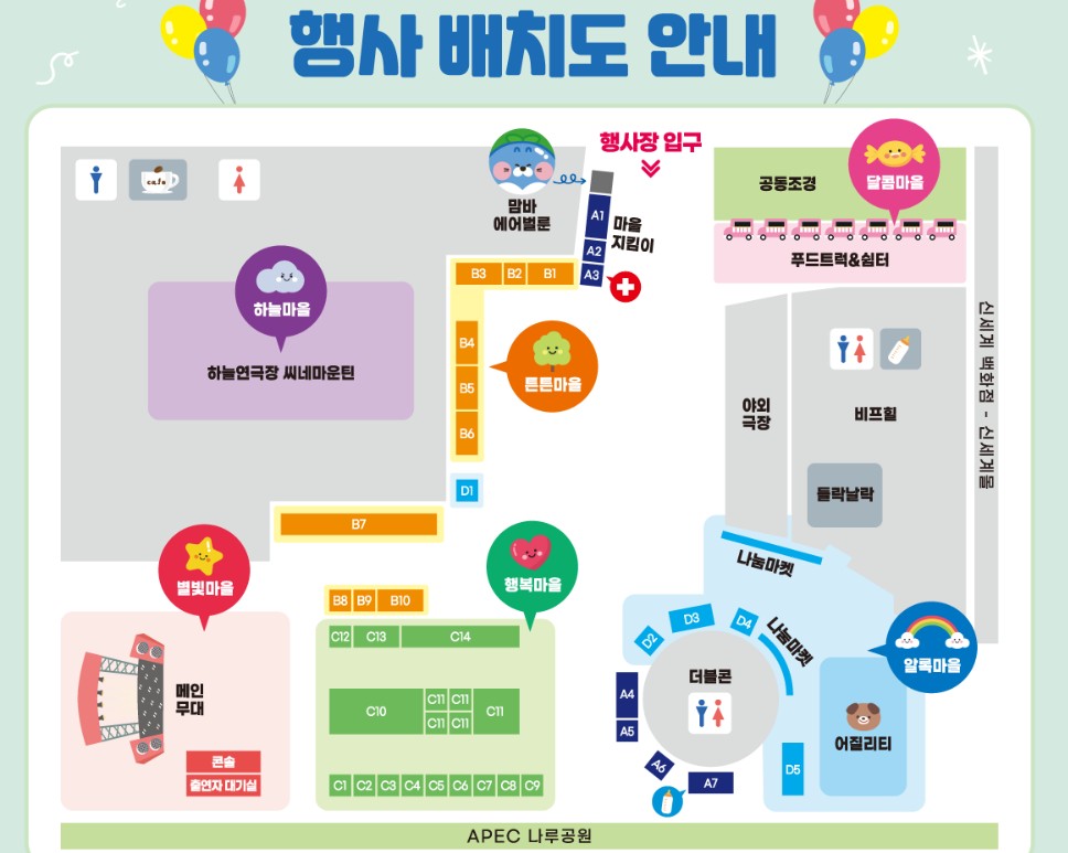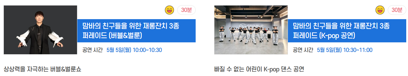 - 재롱잔치 3종 퍼레이드: 버블, 벌룬 등 아이들이 참여하는 퍼레이드