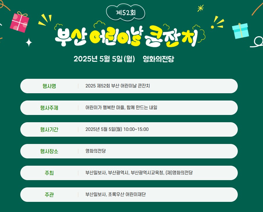 2025년 부산 어린이날 큰잔치는 아이들에게는 꿈과 희망을, 가족에게는 소중한 추억을 선사하는 특별한 하루가 될 것입니다. 다양한 프로그램과 체험을 통해 아이들의 상상력과 창의력을 키우고, 가족 간의 유대감을 더욱 깊게 할 수 있는 기회입니다. 5월 5일, 영화의전당에서 여러분을 기다립니다!