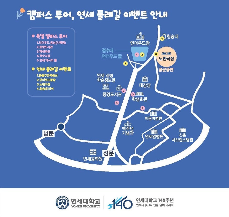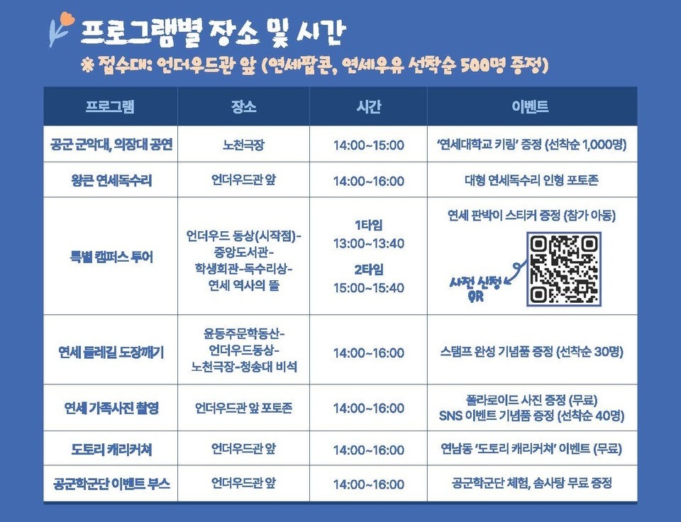 | 상시 운영 | 특별 캠퍼스 투어 | 캠퍼스 전역 | 연세대 학생홍보대사 진행, 선착순 마감 |
