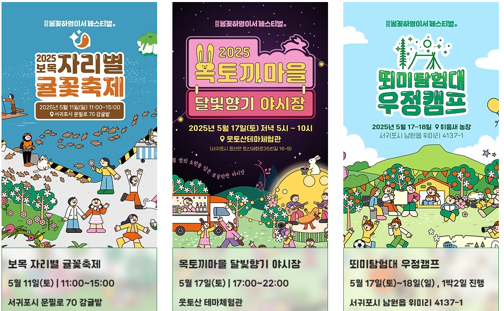 | 5월 11일 | 보목동 | 보목자리별 귤꽃축제 | 지역 먹거리 체험, 전통놀이 등 |