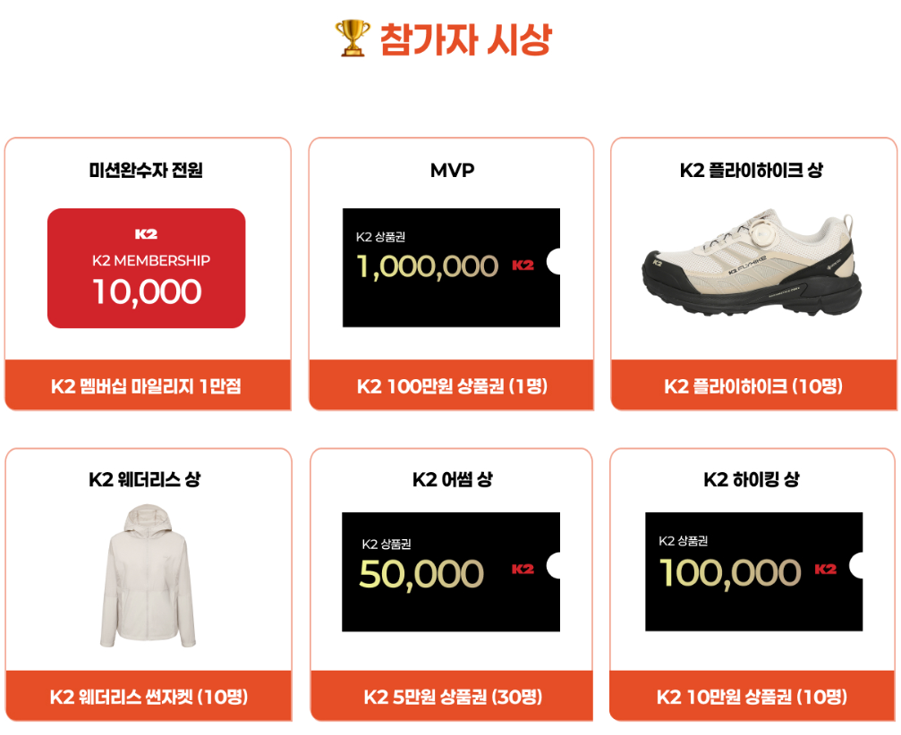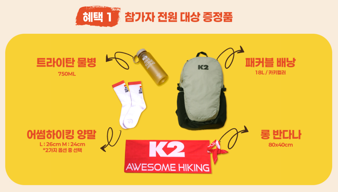 2025 K2 어썸하이킹은 참가자 전원에게 풍성한 혜택을 제공합니다.
