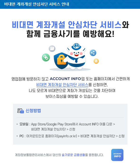 - 또는 ‘어카운트인포’ 앱 설치 → 비대면 계좌개설 안심차단 메뉴 선택