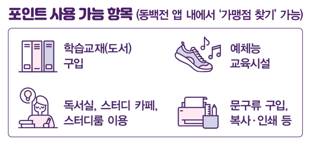 - 사용처 : 지역서점 및 온라인 지정 서점, 학습공간(독서실), 예체능 교육시설, 문구점 등