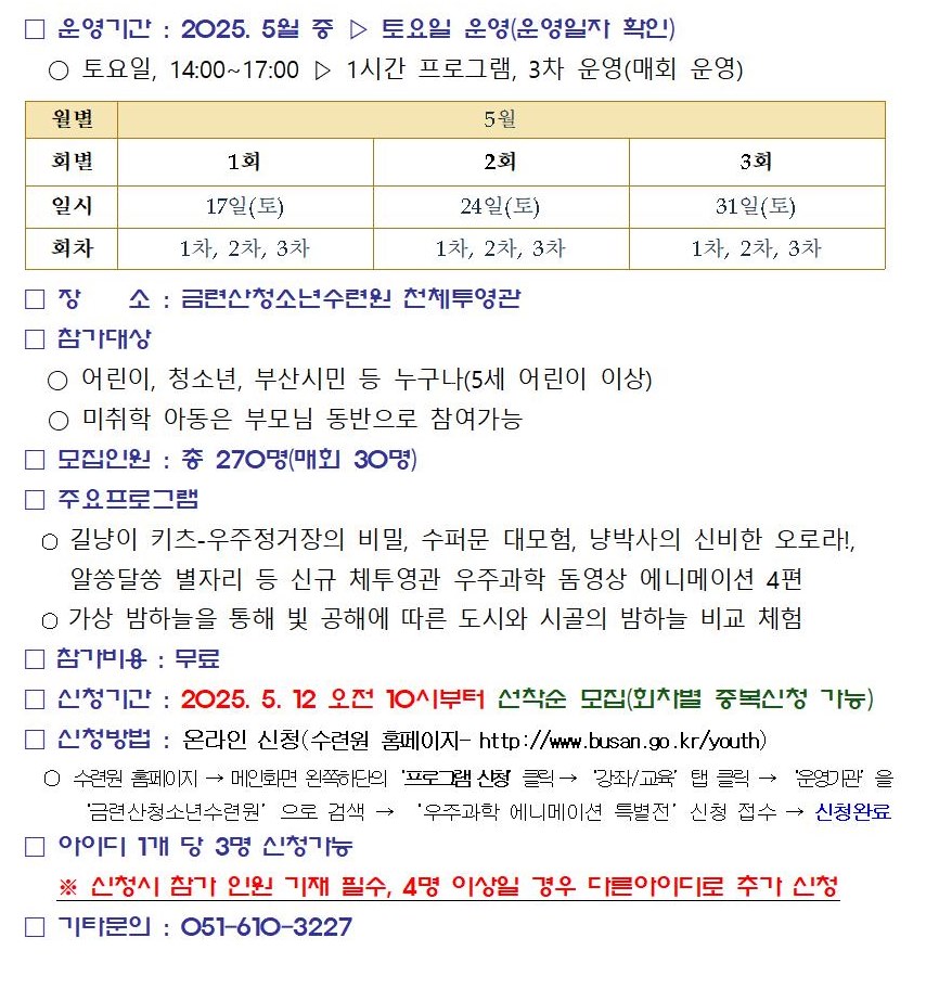 - 문의: 051-610-3227 (부산시설공단 청소년수련원)