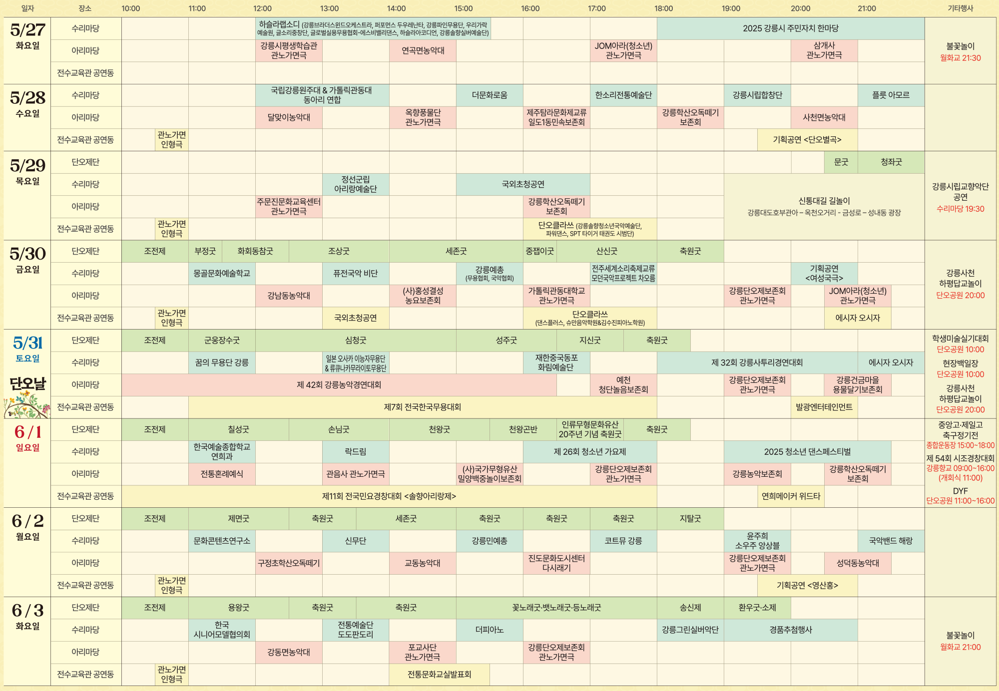 | 5월 31일(토) | 단오날 주요 행사 | 종일 | 단오장 일원 | 단오절 주요 행사 집중 운영 |
