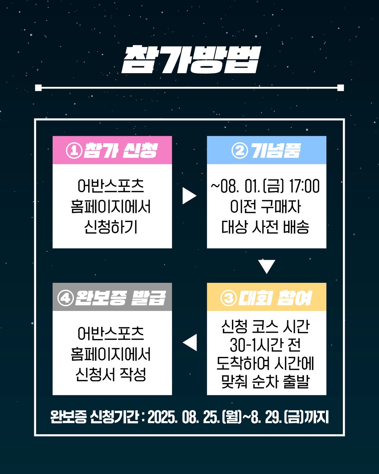 - 우천 시에도 진행 (단, 태풍 및 기상 특보 발효 시 연기 가능)