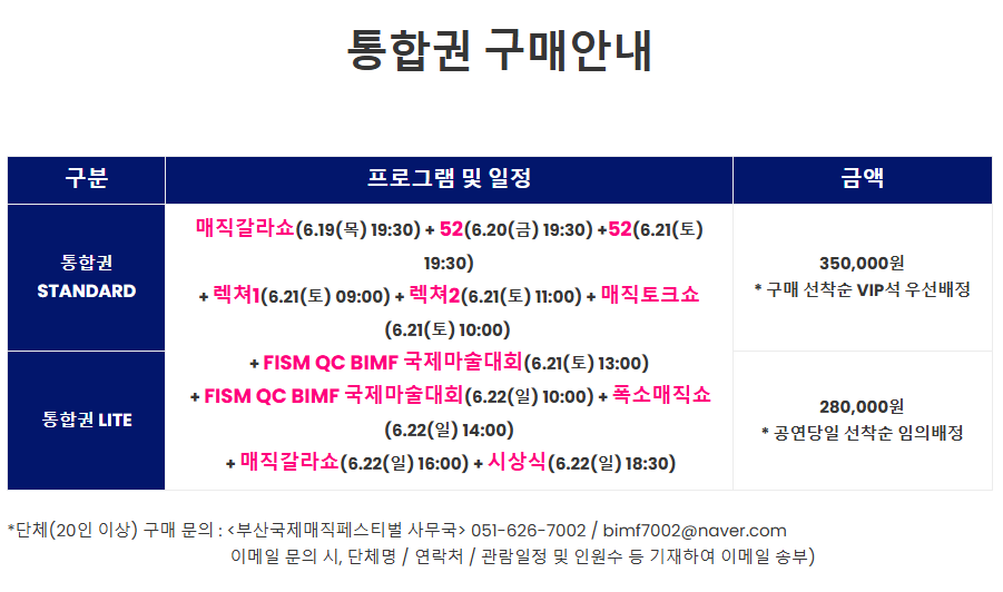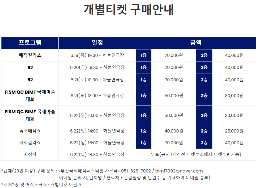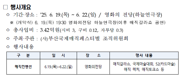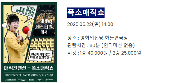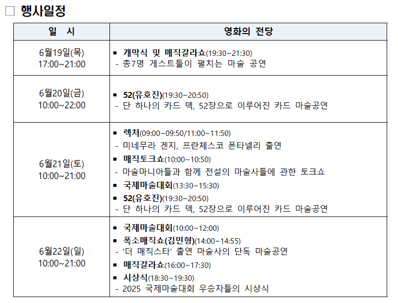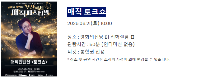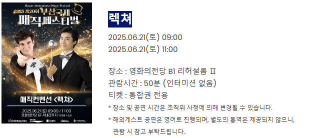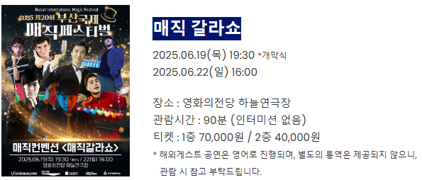 | 매직 컨벤션 | 6월 19~22일 | 영화의전당 하늘연극장 | 6세 이상 |