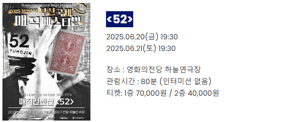 - 단독공연 “52”: ‘SBS 더 매직스타’ 초대 우승자 유호진의 스페셜 쇼