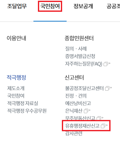 조달청 누리집 - 국민참여 신고센터 - 유휴행정재산신고