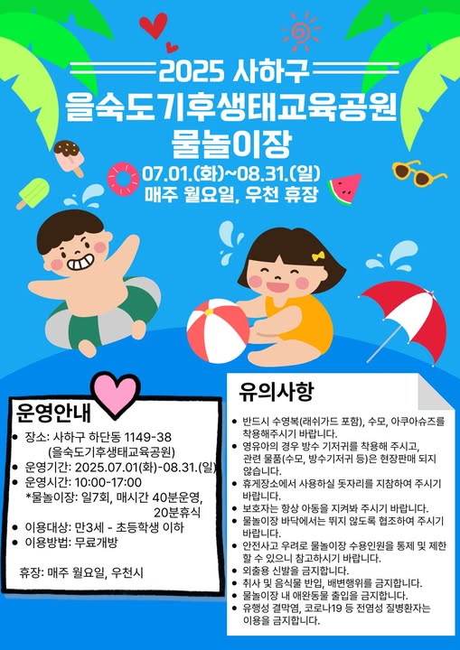 사하구(구청장 이갑준)는 을숙도 기후생태교육공원 내의 부대시설로 조성되어 있는 물놀이장을 오는 7월 1일(화)부터 8월 31일(일)까지 개
