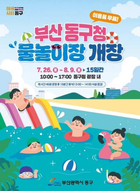 부산 동구(구청장 김진홍)는 관내 초등학교 여름방학을 맞아 오는 7월 26일부터 8월 9일까지 15일간 동구청 광장 내 야외 어린이 물놀이장을 개장한다.동...