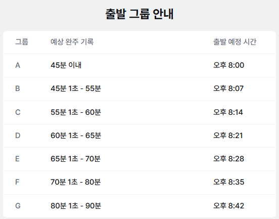 - 출발은 이벤트 예매 시 선택한 아래의 출발 그룹에 따라 오후 8시부터 그룹별 (알파벳 순)로 진행합니다. 10km 예상 완주 기록에 따라 출발 그룹을 선택하여 주시기 바랍니다.
