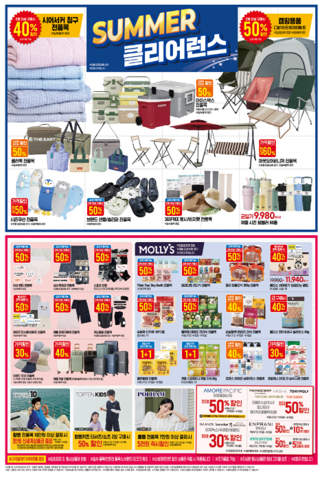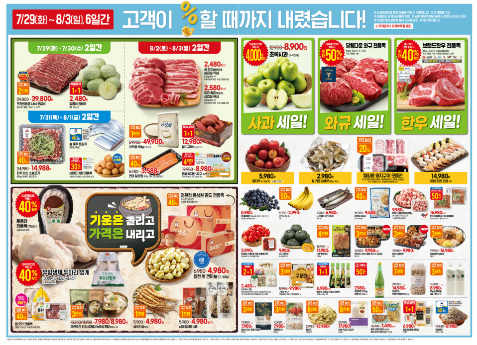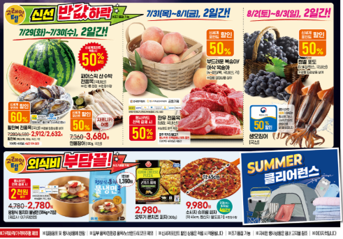 - 수박, 복숭아, 장어, 오징어, 캠벨 포도 등: 여름 제철 과일과 보양식도 50~60% 할인 적용