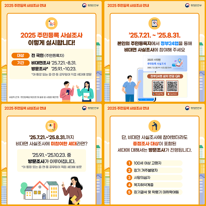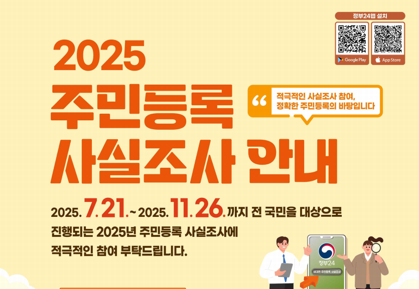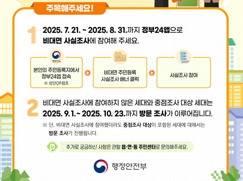 이번 2025 주민등록 사실조사는 전 국민을 대상으로 실시되는 대규모 조사이기 때문에, 사전에 참여방법과 일정을 정확히 파악해두는 것이 중요합니다.