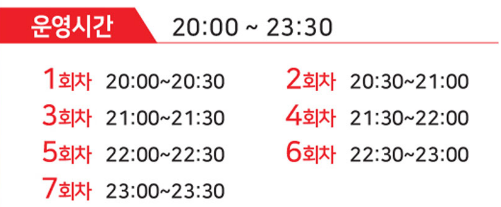 - 운영 시간: 매일 오후 8시부터 11시까지, 30분 단위로 총 7회차 운영