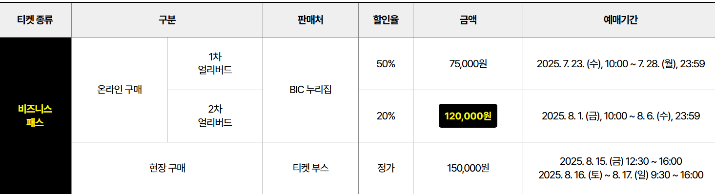 티켓 환불 정책 또한 명확하게 공지되어 있으며, 온라인 및 비즈니스 패스의 경우 행사 시작 2일 전까지, 오프라인 티켓은 행사 3일 전까지 환불이 가능하다. 이후에는 환불이 불가하므로 예매 시 주의가 필요하다.