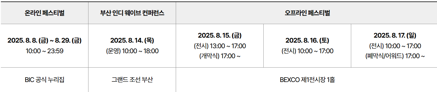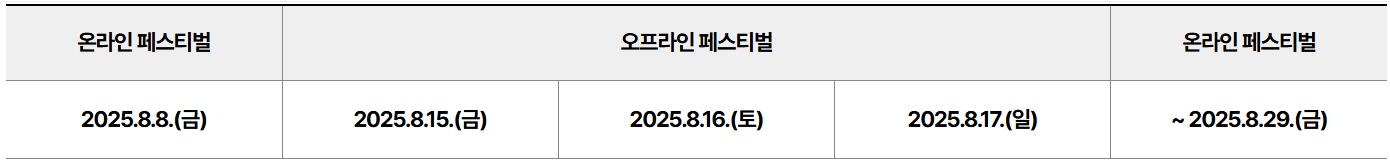 오프라인 페스티벌 일정 : 2025.8.15.(금) 13:00 ~ 17:00 / 2025.8.16.(토) ~ 8.17.(일) 10:00 ~ 17:00