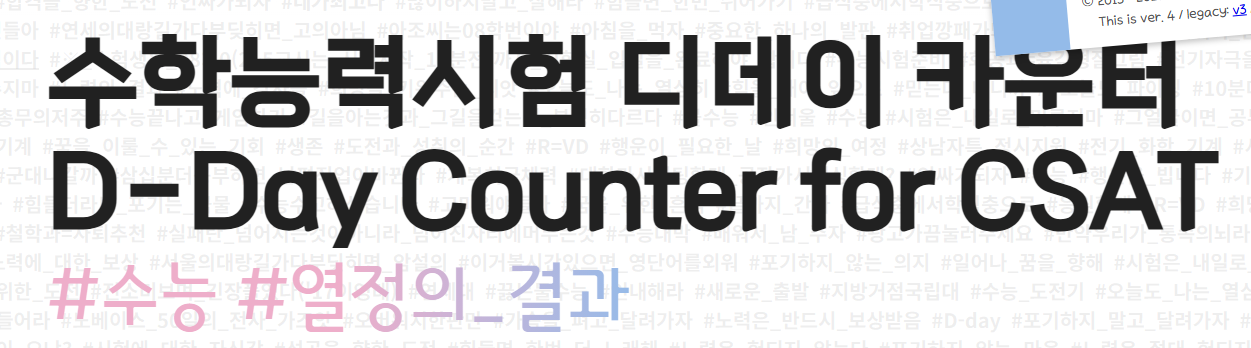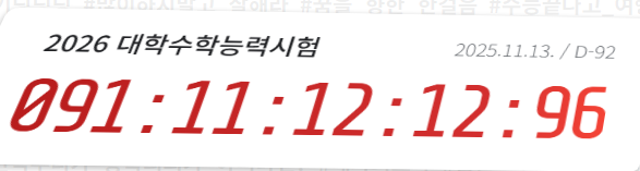 - 일부 웹사이트에서는 수능일까지 남은 시간을 실시간으로 카운팅해주는 기능을 제공합니다. PC 화면에 띄워두고 공부하다가 틈틈이 확인하기 좋습니다.