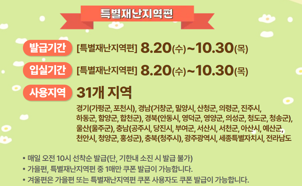 - 주의 사항: 가을편과 특별재난지역편 중 한 장만 발급 가능하지만, 특별재난지역 쿠폰을 먼저 사용한 경우 겨울편 쿠폰 발급 자격이 주어질 수 있음