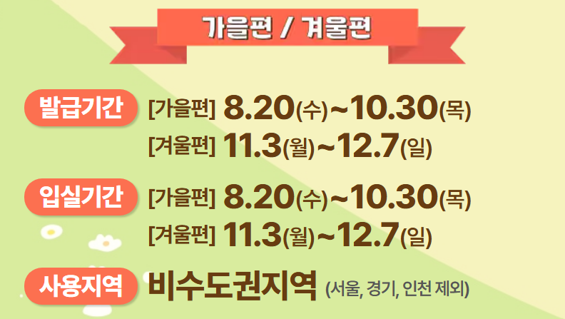 - 발급 및 입실 기간: 가을편과 동일(8월 20일 ~ 10월 30일)