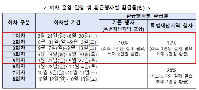 - 특별재난지역 우대 환급: 재난 피해 지역에서 시행되는 경우에는 환급률이 추가로 상향되어 최대 20% 환급(기존 10%에 추가 10%) 형태로 제공되는 회차도 운영되었습니다. 이 경우 최소 결제금액 및 환급 한도 규정이 별도로 적용됩니다.