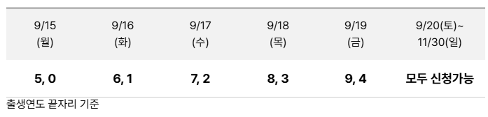 - 주의: 초기 신청일(예: 9월 15일)에는 출생연도 끝자리 기준 5부제 등 접수 제한이 있을 수 있으니 공지 일정을 확인하세요.