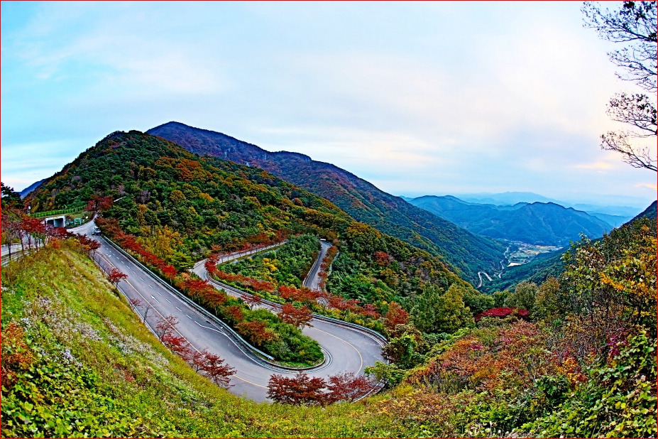 산등성이를 타고 흐르는 도로 라인과 능선을 파노라마로 담으면, 의령 대표 드라이브 코스의 광활함이 표현됩니다.