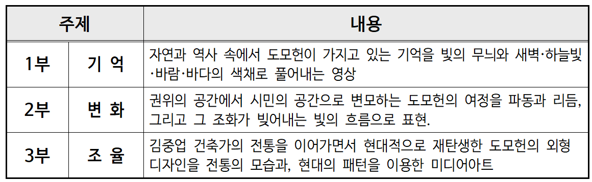 이 전시행사는 도모헌의 이야기를 *“기억·변화·조율”*이라는 주제로 풀어낸 미디어아트 콘텐츠를 건물 외벽에 투사하여 보여 줍니다. 영상은 약 10분 길이의 콘텐츠가 3회 연속 송출되어, 다양한 각도와 타이밍에서 다채로운 감상을 할 수 있도록 설계되어 있습니다.