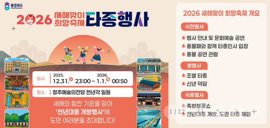 청주에서는 문화공연과 함께하는 대규모 제야의 종 타종행사가 개최됩니다.