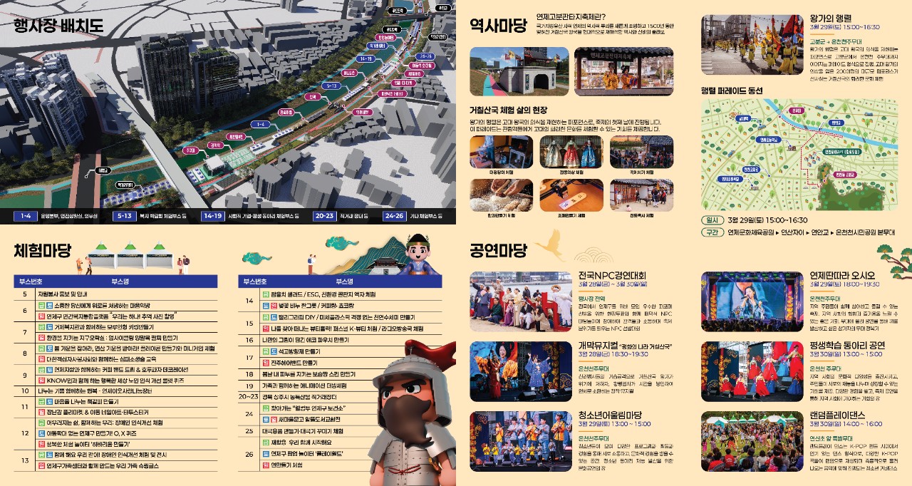 올해 축제에서는 지역 축제 최초로 전국 NPC 경연대회가 개최됩니다. NPC(Non-Player Character) 콘셉트를 가진 참가자들이 직접 창작한 캐릭터로 분장하여 개성 있는 퍼포먼스를 펼치는 대회로, 유머와 창의력이 돋보이는 무대가 펼쳐질 예정입니다. NPC 경연대회는 방문객들에게 색다른 볼거리를 제공하며, 참여자들에게는 창작의 즐거움을 선사할 것입니다.