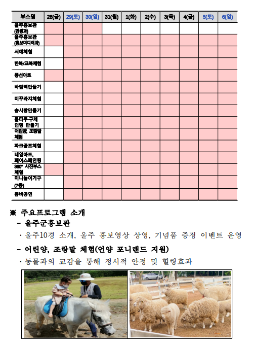 - 지역 문화 체험: 울주군의 전통 문화와 공예 체험 프로그램이 준비됩니다.